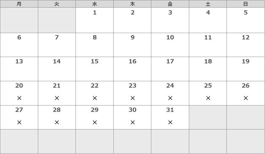 空欄:空いてます △:わずかに空いてます ×:対応が難しいです 休:休業日(カッコは仮予定)