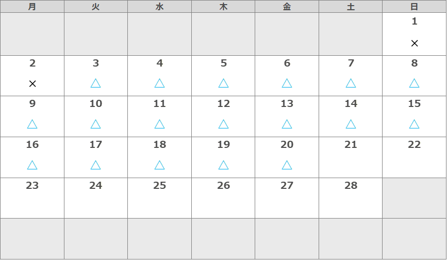 空欄:空いてます △:わずかに空いてます ×:対応が難しいです 休:休業日(カッコは仮予定)