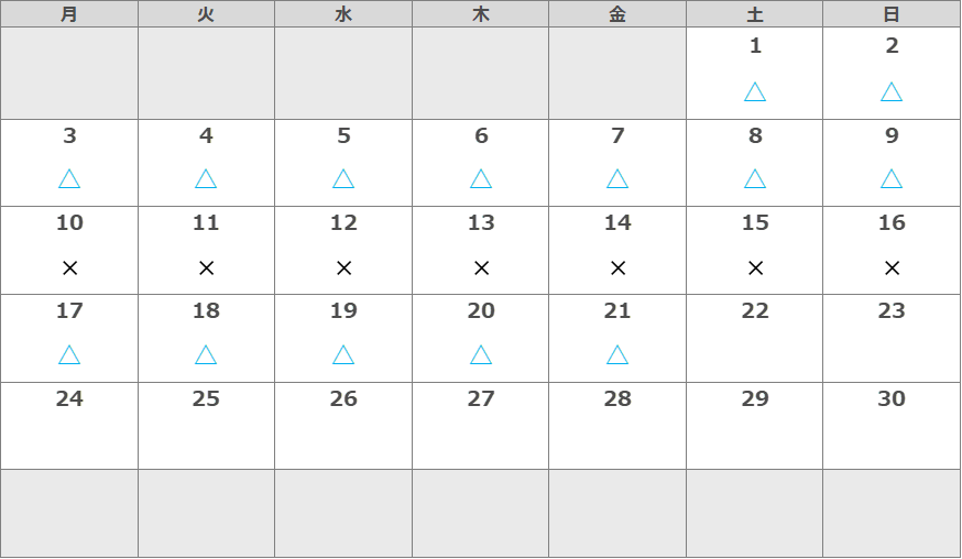 空欄:空いてます △:わずかに空いてます ×:対応が難しいです 休:休業日(カッコは仮予定)
