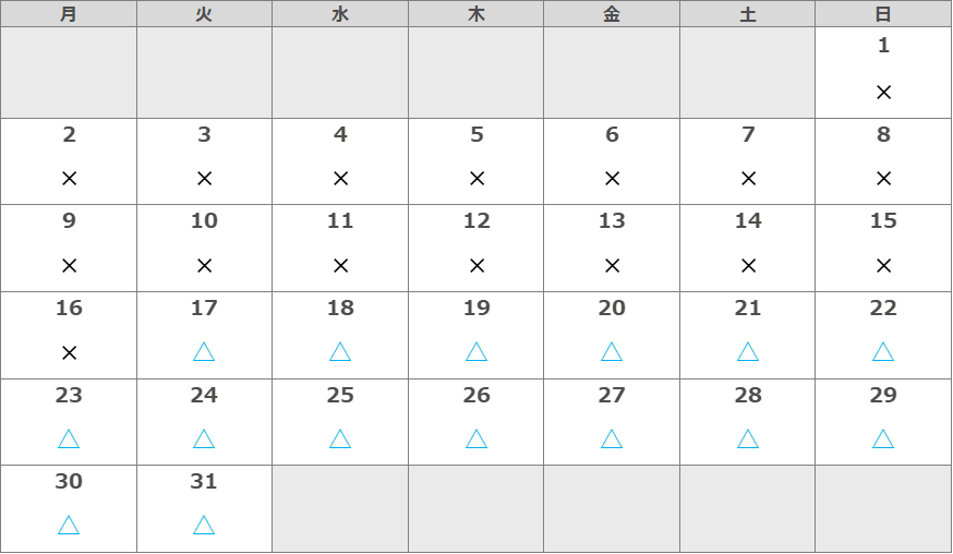 空欄:空いてます △:わずかに空いてます ×:対応が難しいです 休:休業日(カッコは仮予定)